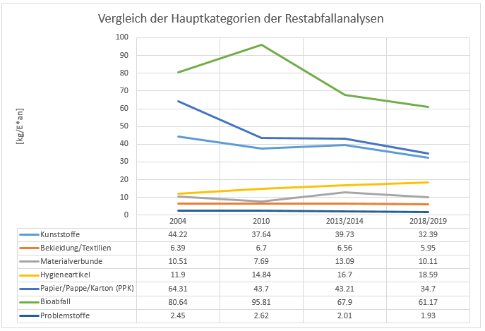 Die folgende Tabelle stellt die Resultate der aktuellen und vergangenen Restabfallstudien vergleichend dar.