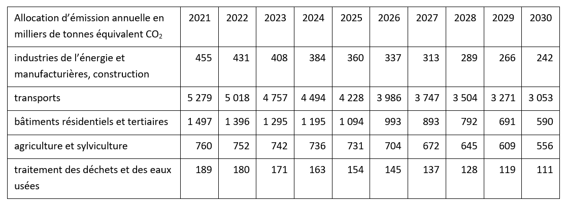 La délimitation de ces cinq secteurs est définie avec précision dans l’annexe de la loi modifiée du 15 décembre 2020. Par ailleurs, cette dernière précise encore les trois principes selon lesquels les allocations d’émissions annuelles sont déterminées, à savoir :