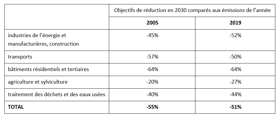 La loi modifiée du 15 décembre 2020 relative au climat avait en effet retenu, outre l’objectif de la neutralité climatique d’ici 2050 au plus tard, un objectif de réduction des émissions de gaz à effet de serre au niveau national de 55 % d’ici à 2030 par rapport au niveau de 2005. Cet objectif concerne l’ensemble des émissions attribuées au Luxembourg au titre du règlement (UE) 2018/842. Seules les émissions couvertes par le système communautaire d'échange de quotas d'émission de gaz à effet de serre (une vingtaine de grandes installations industrielles ainsi que l’aviation) sont exclues.
