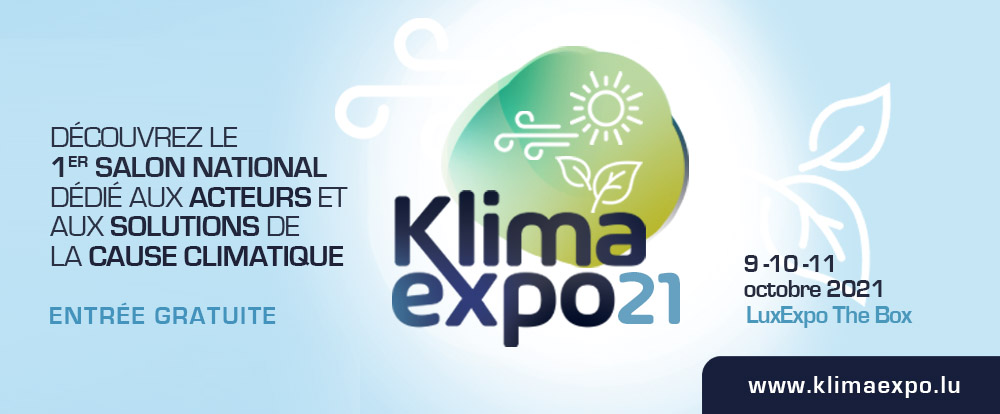 Faisant office de préambule à la COP26, KlimaExpo est le 1er salon national dédié aux acteurs et aux solutions de la cause climatique. Cet événement, qui aura lieu du samedi 9 au lundi 11 octobre prochain à la LuxExpo The Box, se veut un lieu de découverte, d’apprentissage et d’échange pour tout le monde sur le thème du réchauffement climatique.