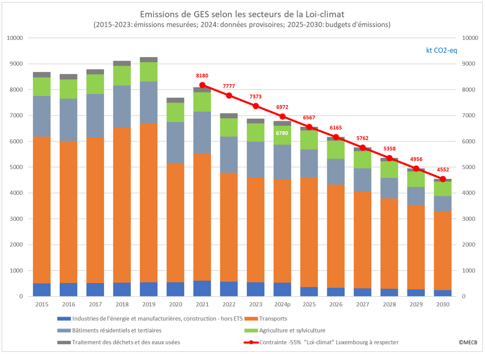 La loi modifiée du 15 décembre 2020 relative au climat retient, outre l’objectif de la neutralité climatique d’ici 2050 au plus tard, un objectif de réduction des émissions de gaz à effet de serre au niveau national de 55 % d’ici à 2030 par rapport au niveau de 2005. Cet objectif concerne l’ensemble des émissions attribuées au Luxembourg au titre du règlement (UE) 2018/842. Seules les émissions couvertes par le système communautaire d'échange de quotas d'émission de gaz à effet de serre (une vingtaine de grandes installations industrielles ainsi que l’aviation) sont exclues.