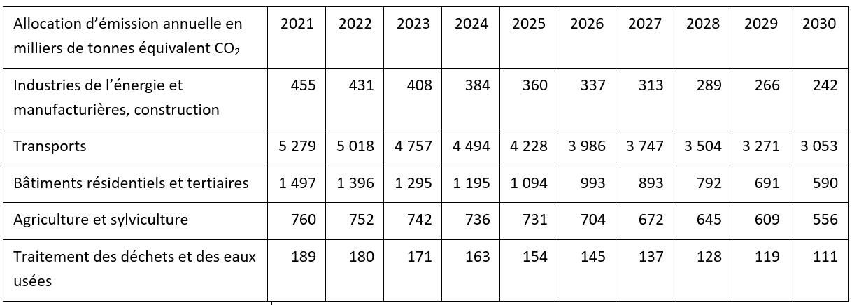 1. Tableau des allocations d’émissions annuelles de gaz à effet de serre pour la période allant jusqu’au 31 décembre 2030