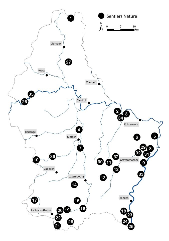 Nos sentiers nature et forêt vous plongeront en pleine nature et vous sensibiliseront à l’importance de la protection de l’environnement. L’administration de la nature et des forêts dispose d’un réseau de 36 sentiers à travers le Grand-Duché, qui vous font découvrir une nature d’une grande diversité. Des supports informatifs sous forme de panneaux, de brochures et de dépliants fournissent de nombreuses informations sur la flore et la faune, mais également sur le patrimoine culturel des paysages et sur les mesures qui visent à protéger les habitats naturels.
