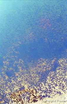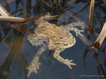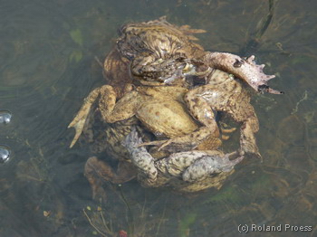 Da bei der Erdkröte 5-10 Mal mehr Männchen als Weibchen am Laichgeschehen teilnehmen, umklammern die Männchen auf der Suche nach den wenigen Weibchen alles was sich bewegt und teilweise „hängen“ bis zu 15 Männchen an einem Weibchen. Die 3.000-6.000 Eier werden in langen Schnüren (im Unterschied zu den Fröschen die Laichballen ablegen!) an der Wasservegetation oder an im Wasser liegenden Ästen befestigt.