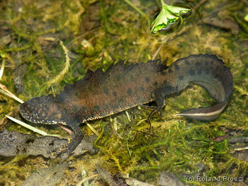 Mit einer Körperlänge von 12-16 cm ist der Kammmolch die größte der 4 einheimischen Molcharten. Charakteristisch für Molche sind die Balzrituale, die im Frühjahr in klaren Flachwasserbereichen gut beobachtet werden können: Das Männchen schwimmt vor das Weibchen, legt den Schwanz nach vorn und führt damit vibrierende Bewegungen durch. Dadurch gelangen Duftstoffe in Richtung der Partnerin. Der Kammmolch wird in den Anhängen II und IV der europäischen Habitatschutzdirektive (92/43/CEE) geführt.