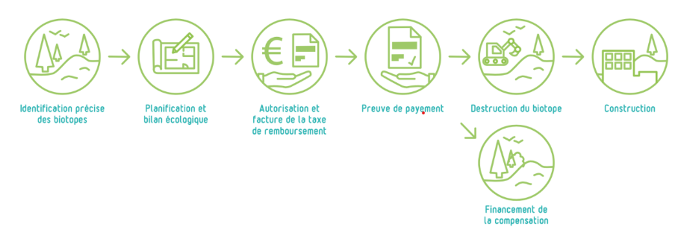 1. Finanziell Kompensatioun a Form vum Ausgläich vun enger Taxe, déi integral an den Ëmweltfong fléisst, a wouraus spéider groussflächeg Naturschutzprojeten op nationalem Terrain ëmgesat ginn ;
