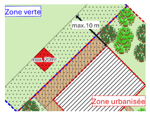 Zénk ronderëm Parzellen, op deenen eng Konstruktioun (Wunnhaus, Gaardenhaischen, Juegdbud...) steet, brauche keng Naturschutzgeneemegung, ënnert der Konditioun datt se folgend Krittären erfëllen: